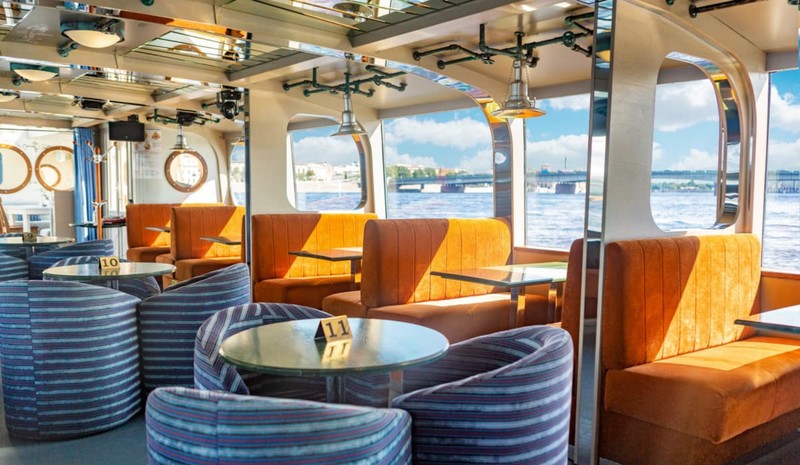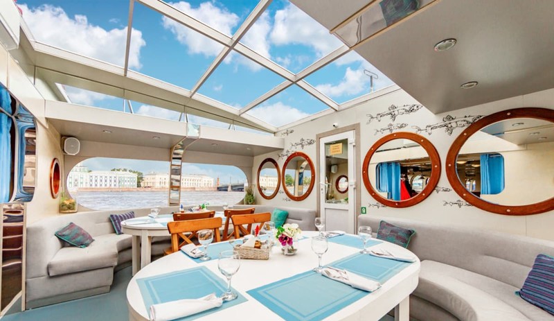 Двухпалубный теплоход-ресторан с большой прогулочной зоной под открытым небом. Вы можете забронировать как просто прогулку под живую музыку, так и ужин. А бокал шампанского получит каждый, независимо от категории билета!