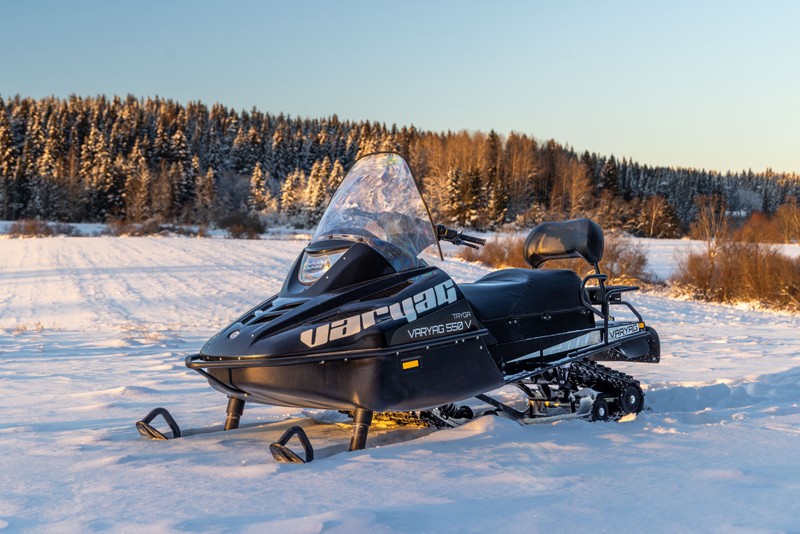 - Едем на новых двухместных снегоходах «Тайга Варяг» российского производства мощностью 55 л.с. Данная модель обладает широкой гусеницей, что обеспечивает максимальную устойчивость в поворотах и гарантирует высокий уровень проходимости по любому рельефу. Максимальная скорость — 80 км/ч